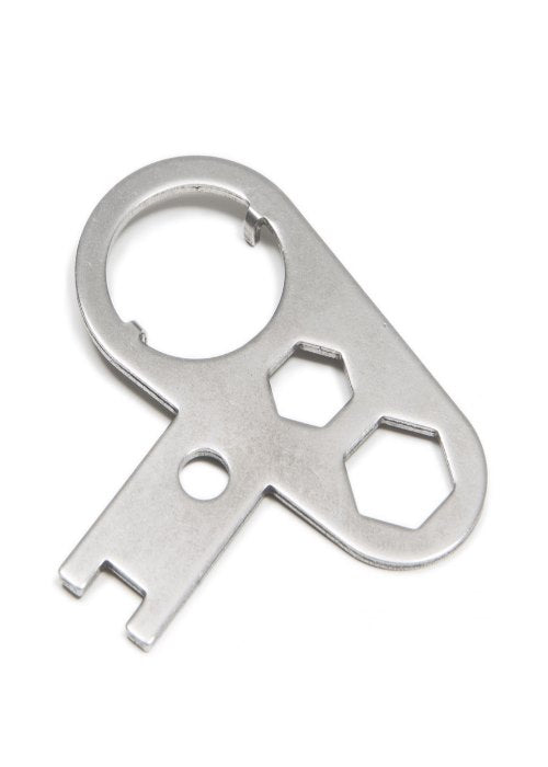 Utilissima chiave per lo smontaggio del pulsante e del attacco per la connessione con frusta esagono da 13. La chiave presenta anche un esagono da 10 mm e la chiave per togliere nottolini delle manopole delle bombole.
