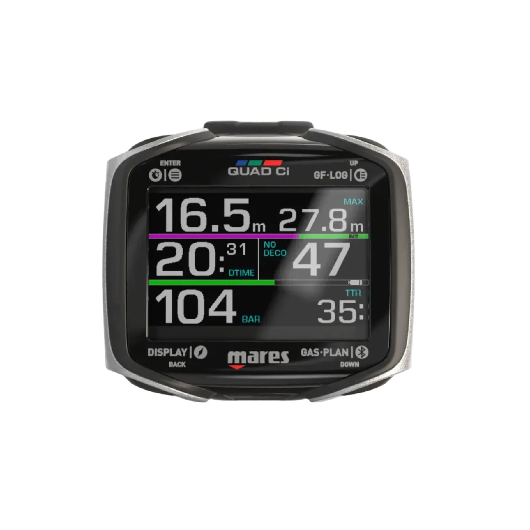 Il computer subacqueo Mares QUAD Ci è lo strumento perfetto per ogni subacqueo. L'algoritmo Bühlmann ZH-L16C permette di adattarle le impostazioni di immersione alle specifiche esigenze di ognuno. Il display MIP a 8 colori fornisce informazioni complete a colpo d'occhio, guidandoti senza problemi attraverso le diverse modalità di immersione, dall'aria al nitrox e al trimix. Il computer integrato QUAD Ci permette la connessione ai dati della bombola tramite il trasmettitore opzionale per un migliore monitoraggio durante le tue immersioni.