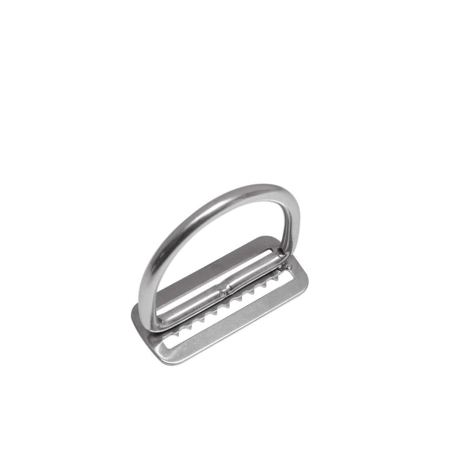 Il D ring saldato sul ferma piombo dentato ha una luce interna orizzontale di 51 mm e luce verticale interna di 40 mm, il tondino è da 5,5 mm. Il ferma piombo con dimensioni esterne 61X27 con dentatura è utilizzato comunemente sui fianchi degli imbraghi.