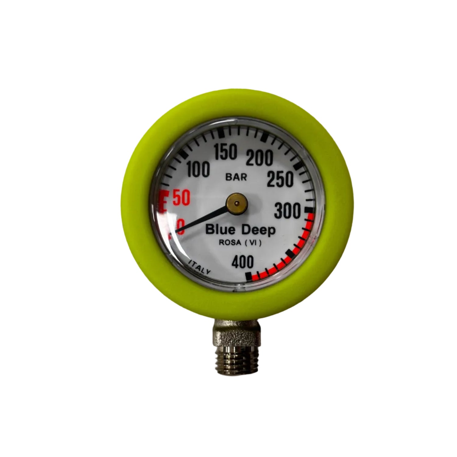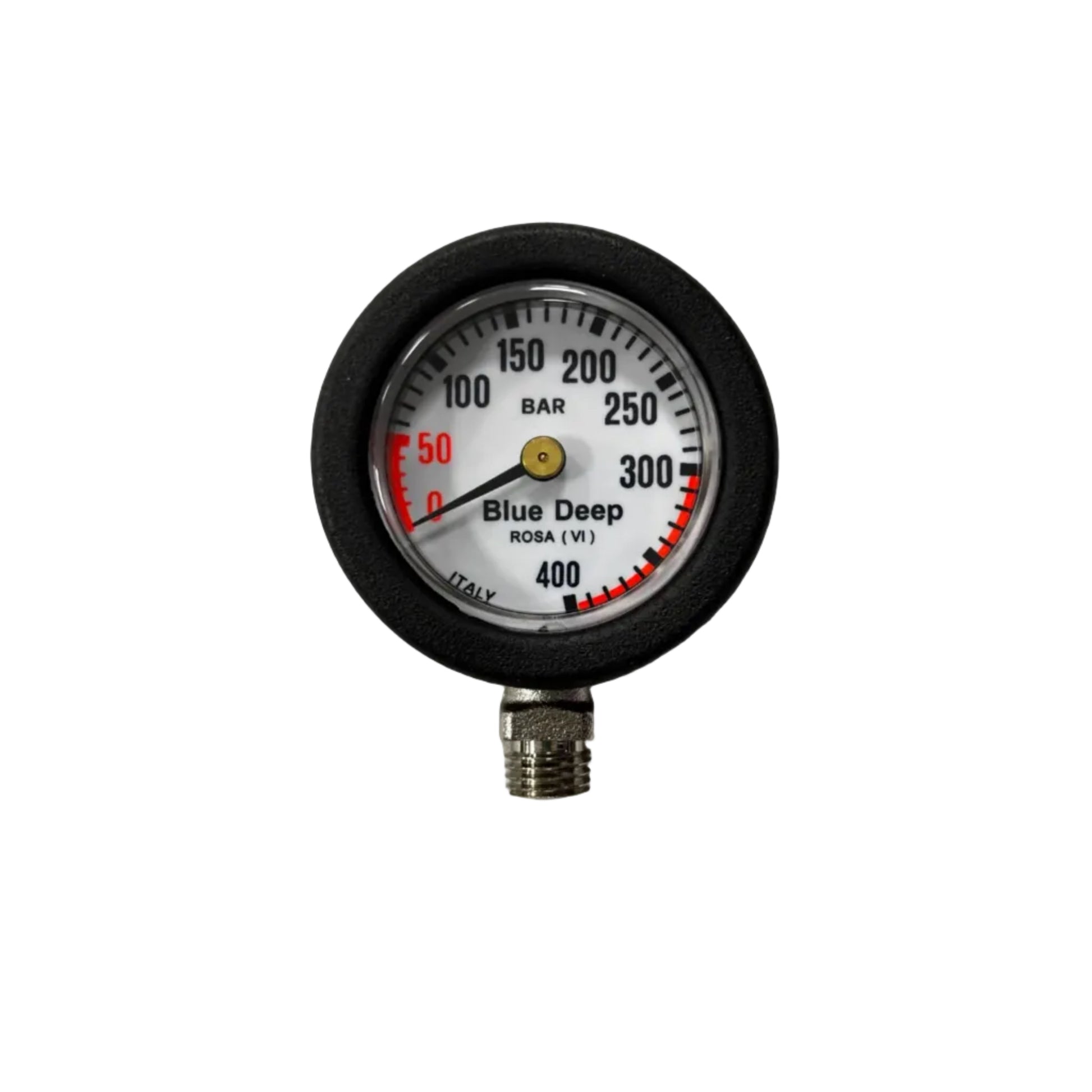 Di piccole dimensioni questo manometro con cassa monoblocco in ottone diametro 50mm, quadrante fondo luminescente con calotta in termoplastico morbido, ha come fondo scala 400 bar, utilizzato sia per bombole di fondo sia per bombole stage. Attacco standard per alta pressione comunemente assemblato con frusta hp. Il guscio in gomma può essere tolto con semplicità. Il quadrante bianco con vetro in policarbonato permette un ottima lettura, rendendo questo strumento tra i piu’ diffusi. Manometro certificato CE normativa EN 250:2014. Made in Italy