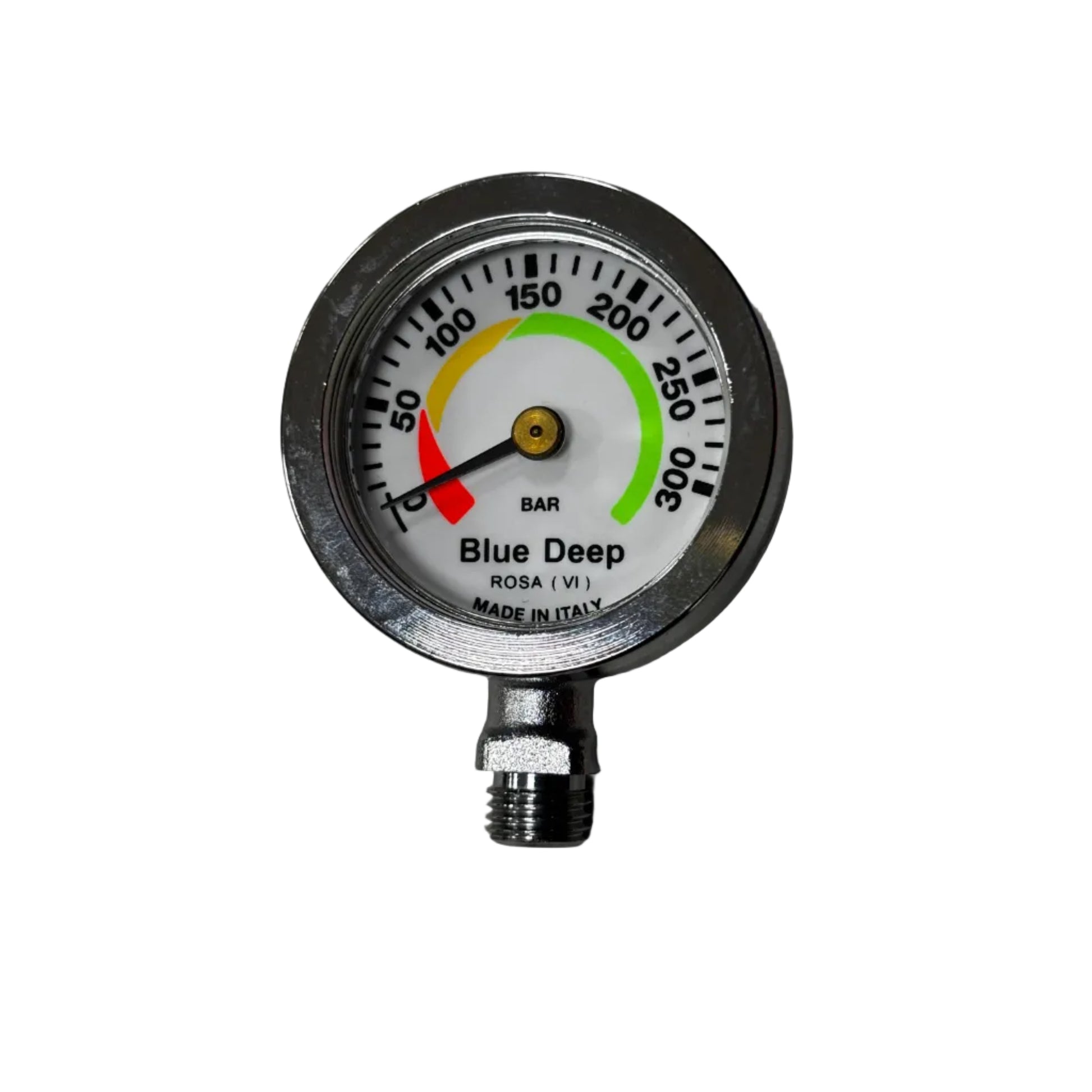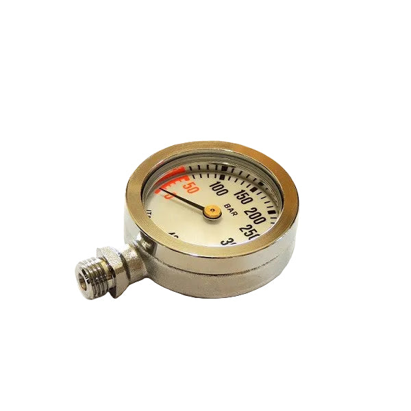Mini manometro subacqueo professionale brevettato caratterizzato da una linea pulita ed essenziale, cassa monoblocco in ottone diametro 50 mm con nuova ghiera sovradimensionata in ottone con spessore di parete di 3 mm entrambe lavorate a controllo numerico e cromate, vetro minerale temperato antigraffio, spessore 5 mm. Il tutto per garantire una robustezza strutturale ancora superiore rispetto al nostro modello VALE Tempered Glass. Quadrante fondo luminescente- settori colorati.Testato a 50 bar ~ 500 mt. di profondità. Made In Italy