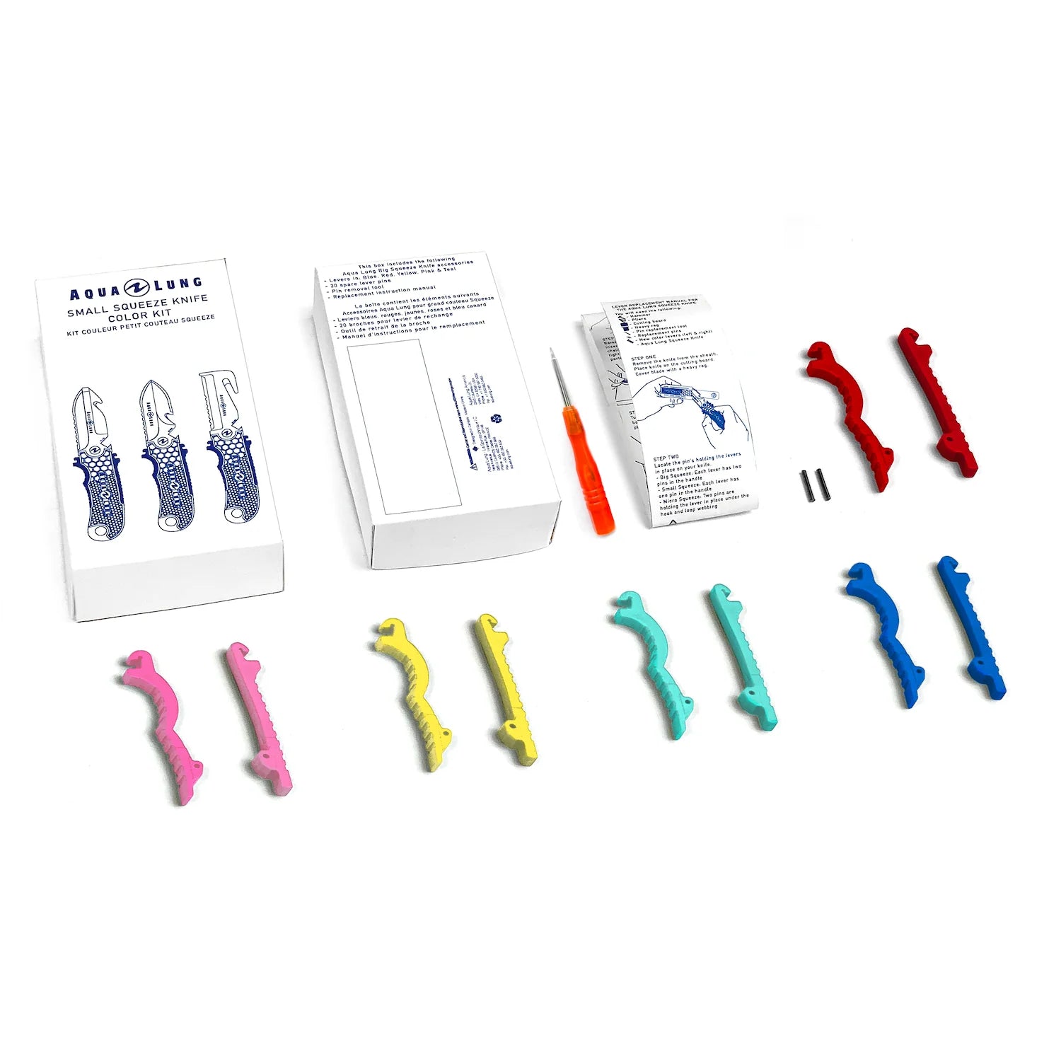 Il Kit Colorazione Squeeze è compatibile con tutti i nuovi coltelli Micro Squeeze Aqua Lung e contiene: istruzioni, un utensile di ricambio, perni di ricambio e leve colorate in rosso, rosa, giallo, grigio ghiaccio e blu.