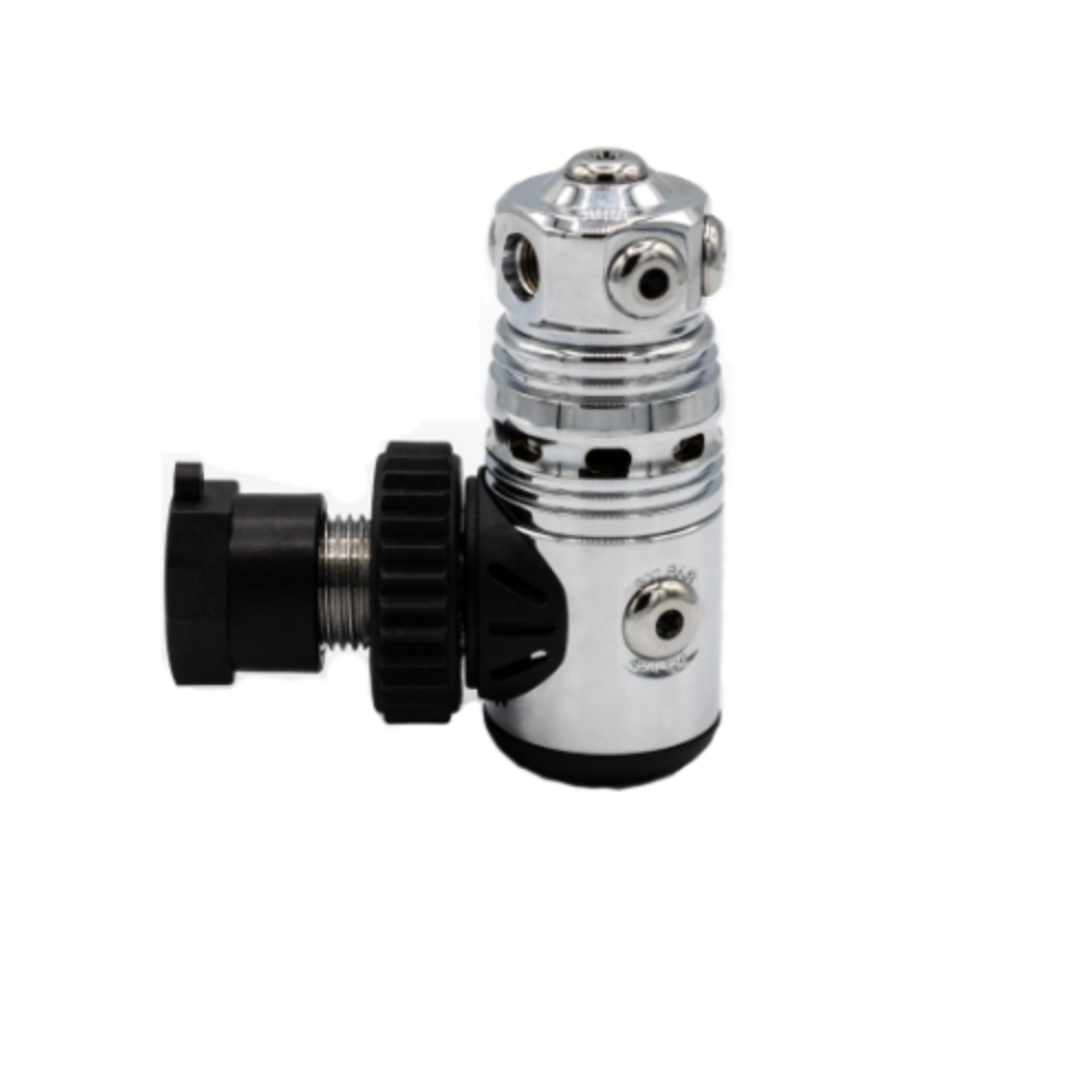 Il primo stadio P110 è particolarmente apprezzato anche per configurazioni side-mount. La torretta girevole presenta 5 uscite di media pressione LP da 3/8”, di cui 4 opportunamente angolate per un’ottimale distribuzione delle fruste, in modo da evitare qualunque interferenza fra le attrezzature collegate.