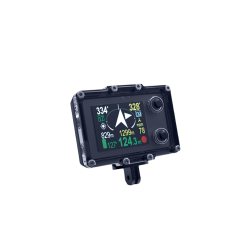 Tutti i dati fondamentali – direzione, rotta della bussola, profondità, distanza dall'obiettivo, tempo stimato di arrivo, velocità attuale e tempo di immersione – sono visualizzati direttamente nel campo visivo del subacqueo, facilitando la navigazione anche ad alte velocità.